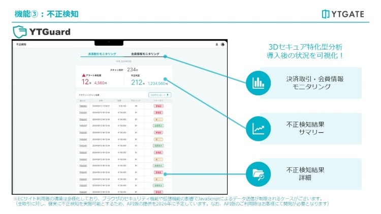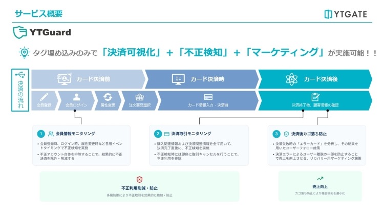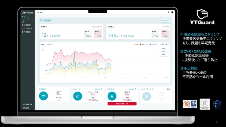 EC事業者が抱える「決済承認率の低下」「不正利用の増加」「カゴ落ち」の3つの課題に対応するサービスです。リアルタイムで決済データを可視化し、カード会社別の承認率やエラー率を把握。外部の不正検知ソリューションと連携して、不正利用やアカウント乗っ取りを検出します。決済失敗時には自動でエラー分析を行い、再決済を促すメッセージを表示することで、売上機会の損失を防ぎます。