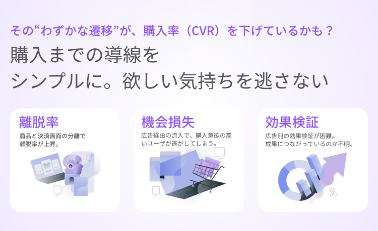 広告やSNSからの流入に最適化された、決済機能付きLPを作成できるアプリです。お客様の興味を途切れさせることなく、ページ遷移なしで同一LP内で購入まで完結。これにより離脱を防ぎ、CVR(購入率)の向上に貢献します。お試しセット、複数SKUの同時購入、定期販売にも柔軟に対応。既存のフリーページ機能でデザインも自由に構築でき、LPごとの効果測定も可能です。